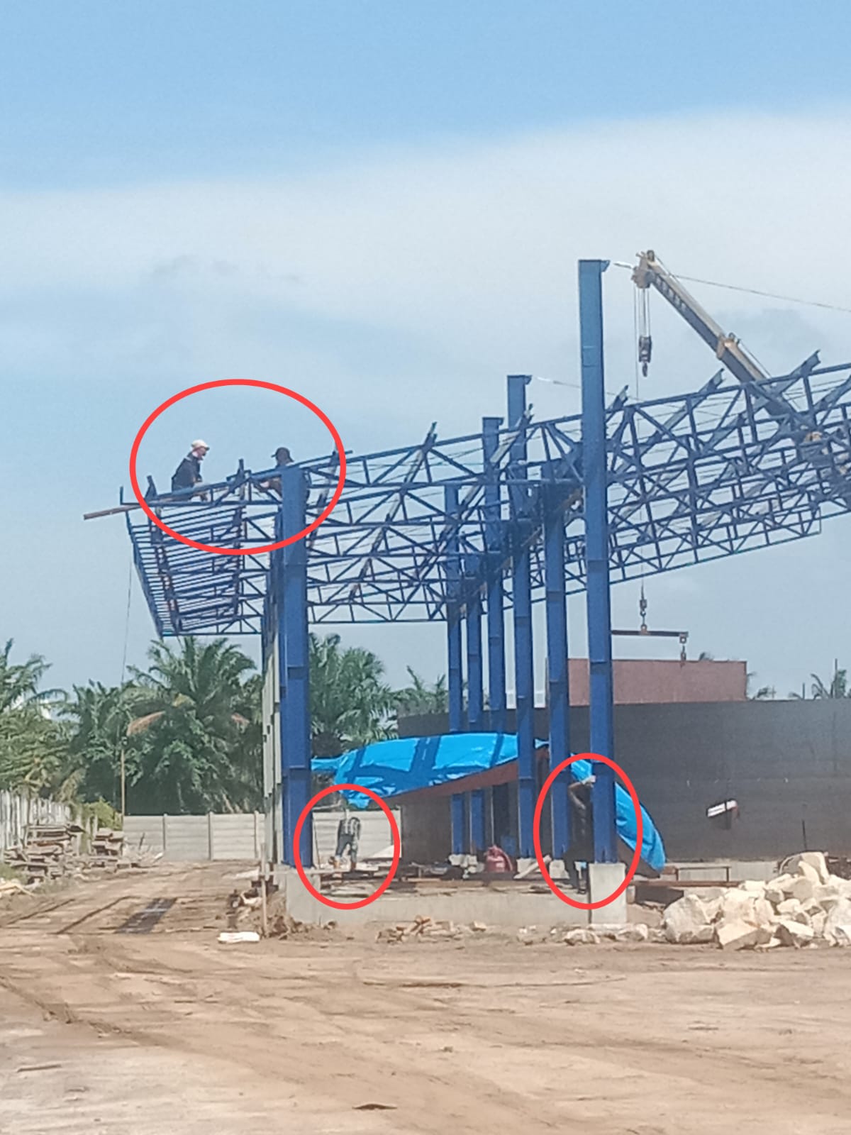 Pantauan di lokasi pada, Selasa (10/03/2026), terlihat jelas beberapa pekerja melakukan pekerjaan konstruksi di ketinggian rangka baja bangunan tanpa perlengkapan keselamatan yang memadai. Bahkan pekerja tampak berada di atas struktur besi dengan risiko jatuh yang sangat tinggi, tanpa pengaman safety belt, helm keselamatan, maupun perlengkapan standard lainnya.
